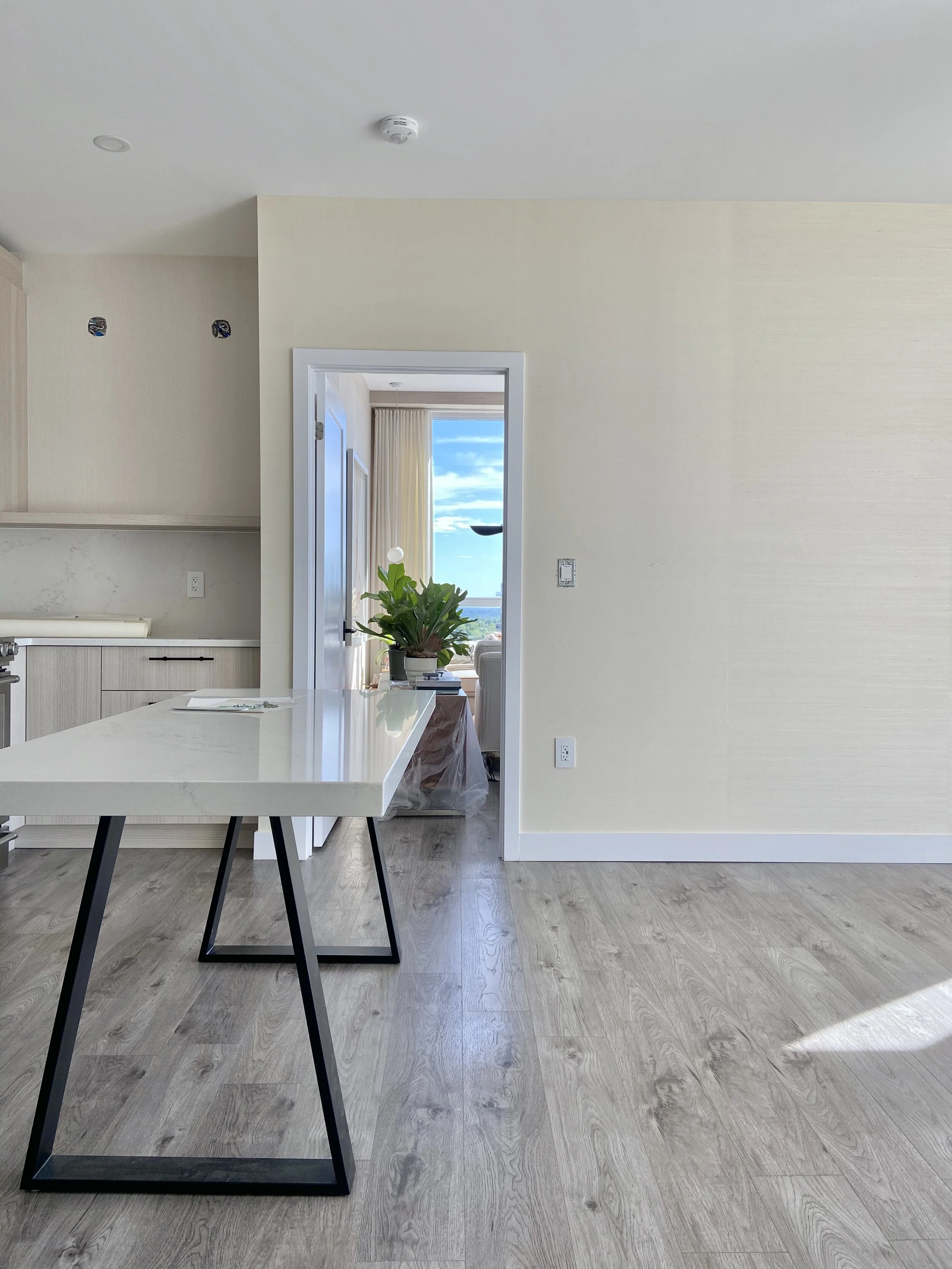 And that officially brings us to Week 6 of One Room Challenge. Chris and I arrived back bright and early to check out our brand new living room, dressed in a beautiful shade of creamy white for an effortlessly elegant look. The transformative power of grasscloth wallpaper is truly spectacular. The texture, the sheen, and the way how it reflects natural light, it’s worth all the effort.